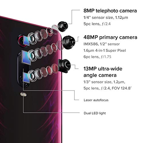 The formidable combination of a 48MP Sony IMX586 ultra high-resolution sensor, a 13MP 124.8° FOV ultra-wide angle camera and a third 8MP telephoto camera delivers crystal clear pictures .You can zoom effortlessly from 0.6x to 2x to capture a far off subject.
