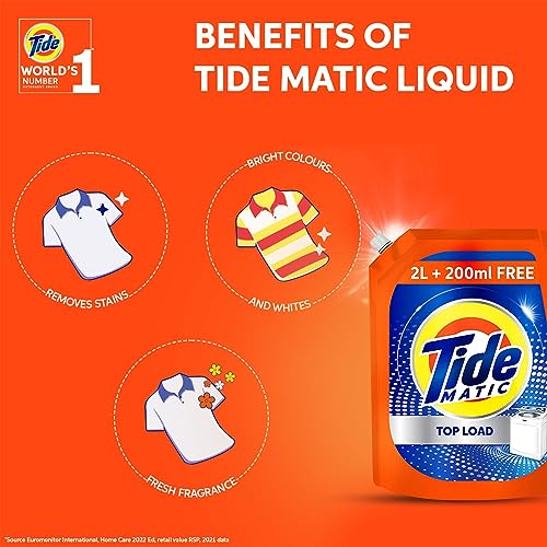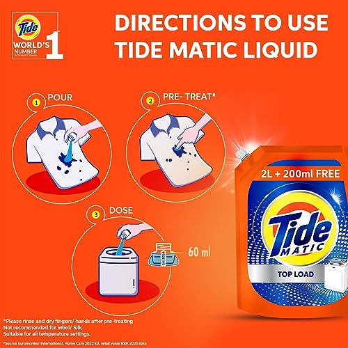 New Tide Matic Liquid removes tough stains inside the machine while taking care of colours to provide you and your family an outstanding and bright clean . With a formula especially designed for Top Load washing machines, Tide Matic Liquid lifts tough stains and locks them inside machine itself , preventing re-deposition on your clothes. It delivers superior cleaning on both white and coloured clothes. It just requires 60 ml for normal loads and 90 ml for heavily soiled loads to provide great performance with value. Tide is the ‘World’s No.1 Detergent Brand’ (Source Euromonitor International, Home Care 2022 Ed, retail value RSP, 2021 data) and is a prominent unit of Procter & Gamble Company. With the New Tide Matic Liquid , you can take a step ahead and experience deep down cleaning like never before.