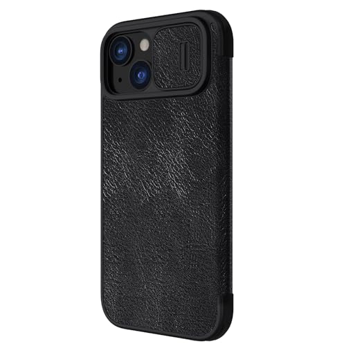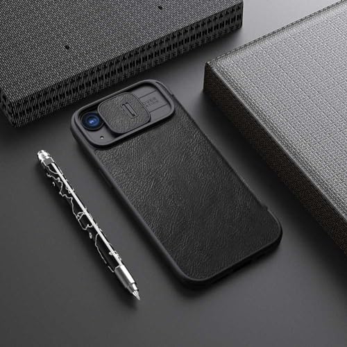 Nillkin Case for Apple iPhone 15 (6.1″ Inch) Qin Pro Camshield Camera Slider Genuine Classic Leather Flip Folio + Card Slot Black Color